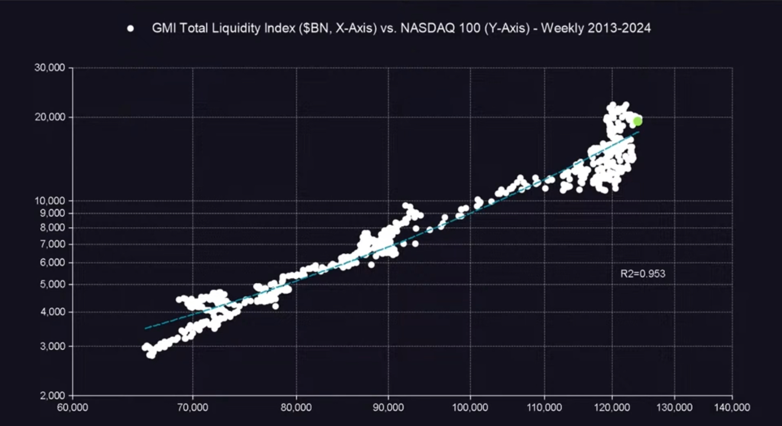 (strong correlation of NASDAQ and Total Liquidity with R2= 0.953)